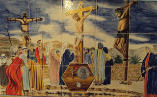 Painel colocado no interior da Capela de Santa Luzia. É visível o fragmento de pedra do Calvário trazido pelo pároco, Padre Joaquim Filipe, da Terra Santa.